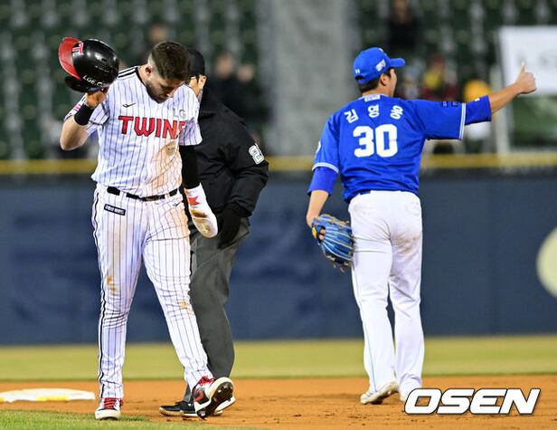 6회말 무사 1루 상황 LG 오지환의 우익수 플라이 때 2루 태그업을 시도한 1루 주자 오스틴이 2루에서 삼성 유격수 김영웅의 태그에 아웃된 뒤 더그아웃으로 향하고 있다. 2024.03.26 / dreamer@osen.co.kr