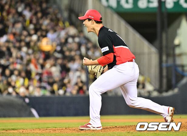 6회말 2사 1,2루 KIA 곽도규가 두산 정수빈을 삼진으로 돌려세운 뒤 기뻐하고 있다. 2024.03.29 / cej@osen.co.kr