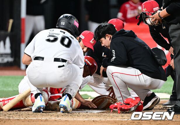 2회말 1사 1루에서 SSG 이지영이 KT 강백호의 배트에 어�? 부위를 맞으며 괴로워하고 있다. 강백호는 포수 스트라이크 낫아웃. 2024.04.12 /jpnews@osen.co.kr
