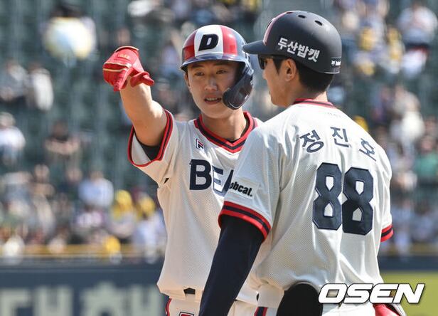 2회말 2사 3루 두산 전민재가 동점타를 날린 뒤 세리머니를 하고 있다. 2024.04.14 /cej@osen.co.kr