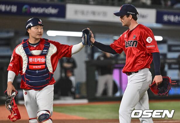 롯데 자이언츠 선발 투수 반즈가 8회초 수비를 무실점으로 마치고 정보근과 하이파이브를 하고 있다. 2024.04.19 / foto0307@osen.co.kr