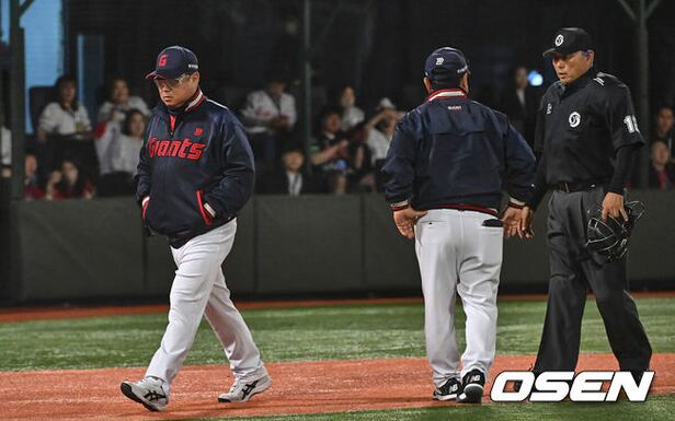 이날 김태형 감독은 "퇴장 당할 줄 알고 나간거다. 여기서 봤을 떼 베이스를 미리 밟고 있었는지, 아니면 베이스 측면을 못 밟고 있었을 수도 있었다. 굉장히 애매했는데 심판에게 물어봤다. 상황이 아쉬웠다"라고 설명했다.