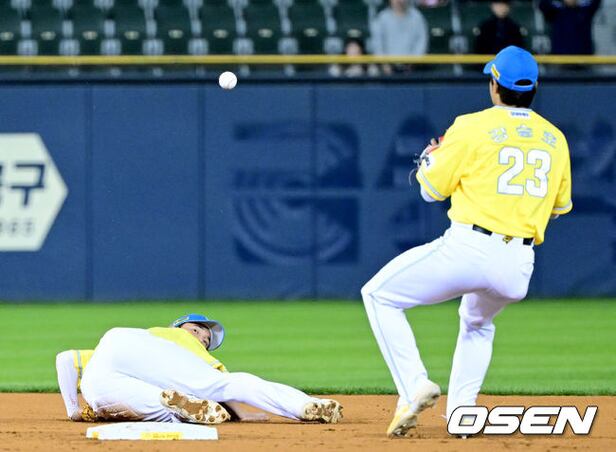 7회초 무사 1루 상황 키움 김휘집의 병살타 때 두산 유격수 박준영이 타구를 잡은 뒤 넘어지며 2루수 강승호에게 송구하고 있다. 2024.04.21 / dreamer@osen.co.kr