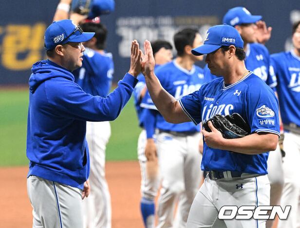 경기 종료 후 삼성 오승환이 박진만 감독과 승리의 기쁨을 나누고 있다. 2024.04.26 /sunday@osen.co.kr