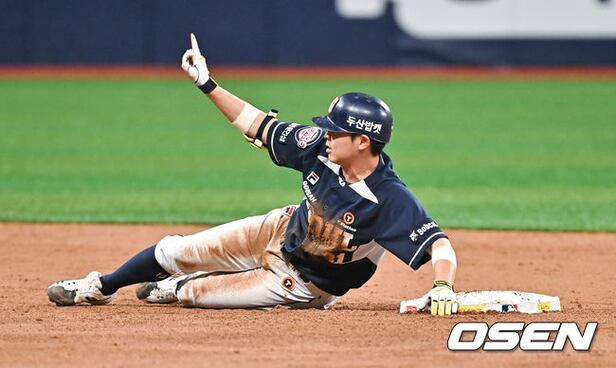 2회초 2사 2루 두산 정수빈이 1타점 적시 2루타를 날린뒤 세리머니를 하고 있다. 2024.05.09 / soul1014@osen.co.kr