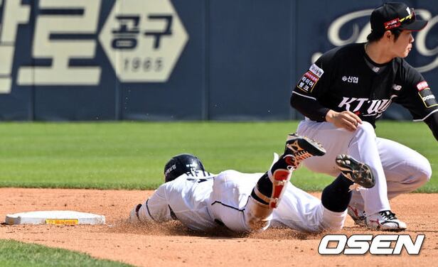 4회말 두산 선두타자 허경민이 2루타를 날린 뒤 KT 유격수 신본기에 앞서 2루에 세이프되고 있다. 2024.05.12 /cej@osen.co.kr