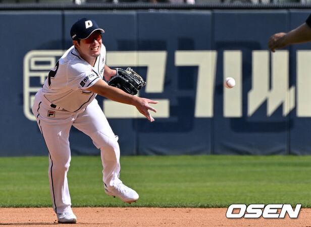 6회초 무사 1루 두산 유격수 김재호가 KT 문상철의 병살타에 2루로 송구하며 더블플레이를 연결짓고 있다. 2024.05.12 /cej@osen.co.kr