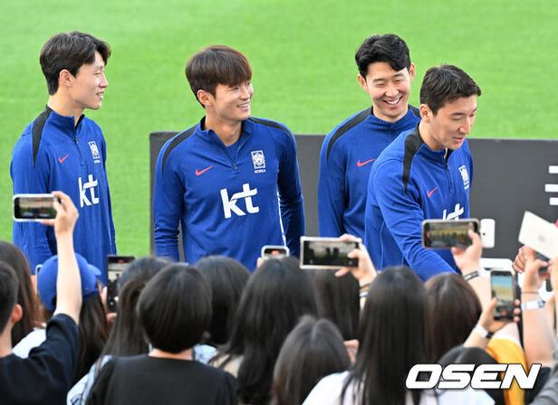 한국 축구대표팀 이재성, 김진수, 손흥민, 정우영이 축구팬들에게 추첨을 통해 사인을 전달하고 있다. 2024.06.08 / rumi@osen.co.kr
