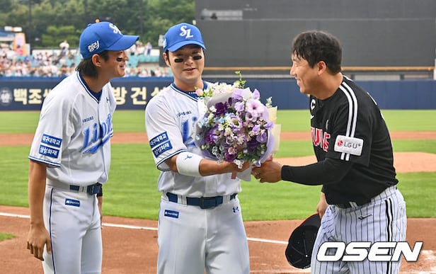 삼성 라이온즈 박병호가 2회말 좌월 솔로 홈런(한미통산 400호)을 치고 LG 김현수로부터 축하 꽃다발을 받고 있다. 2024.06.13 / foto0307@osen.co.kr