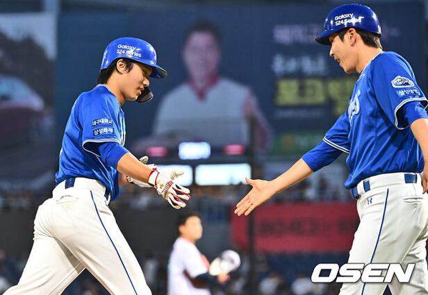 삼성 라이온즈 이재현이 5회초 2사 2루 좌월 역전 2점 홈런을 치고 하이파이브를 하고 있다. 2024.06.14 / foto0307@osen.co.kr