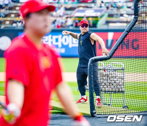 KIA 최형우가 후배 타자들을 위해 베팅볼 투수로 자원 등판해 공을 뿌리고 있다. 2024.06.15 /rumi@osen.co.kr