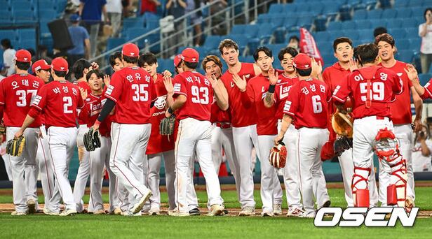 SSG 랜더스 선수들이 삼성 라이온즈에 8-3으로 승리한 후 기쁨을 나누고 있다. 2024.06.18 / foto0307@osen.co.kr