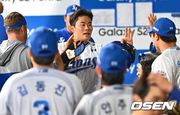 삼성 라이온즈 이창용이 5회말 2사 1루 중견수 왼쪽 데뷔 첫 안타를 치고 동료들의 축하를 받고 있다. 2024.06.19 / foto0307@osen.co.kr