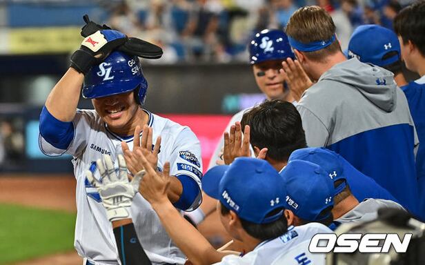 삼성 라이온즈 이성규와 강민호가 6회말 2사 1,2루 김영웅의 역전 2타점 우중간 2루타 때 득점을 올리고 하이파이브를 하고 있다. 2024.06.19 / foto0307@osen.co.kr