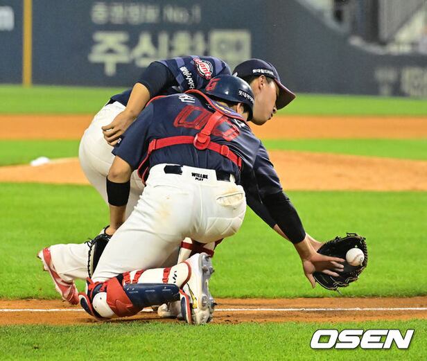 4회말 1사 2루에서 롯데 노진혁, 손성빈이 두산 박준영의 타구에 파울이 되길 기다렸다가 볼을 라인 밖으로 쳐내고 있다. 2024.07.03 / jpnews@osen.co.kr