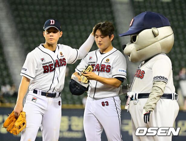 경기를 마치고 두산 박준영이 김택연과 승리를 기뻐하고 있다. 2024.07.23 / jpnews@osen.co.kr