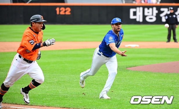 포수 강민호는 1루를 가리키며 가라비토에게 1루로 던져라고 콜을 했다. 그런데 타구가 3루 선상쪽으로 굴러갔고, 가라비토가 달려와 잡았을 때는 좌타자 손아섭이 중간 정도까지 뛰어가고 있었다. 1루로 송구했어도 크로스 타이밍으로 보였다.