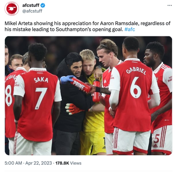 그는 기죽어 있을 램스데일을 안으며 달랬다. 아스날 이야기를 다루는 'afcstuff' 소셜 미디어 계정에 올라온 사진을 살펴보면 아르테타 감독은 스스로 자책하고 있는 듯한 표정을 한 램스데일의 얼굴을 두 팔로 감싸 안았다.