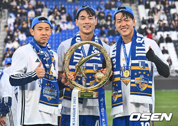 울산 현대 김태환, 김기희, 김영권이 시상식에서 우승 트로피를 들고 포즈를 취하고 있다. 2023.12.03 / foto0307@osen.co.kr
