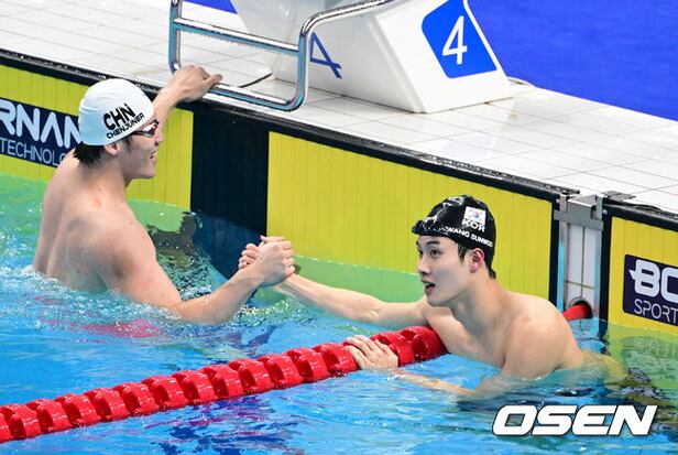 한국 대표팀 황선우가 경기를 마친 뒤 중국 왕하오위와 인사를 나누고 있다. 황선우는 48초04로 동메달을 목에 걸었다. 2023.09.24 / ksl0919@osen.co.kr