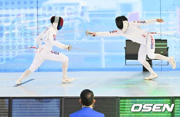 한국 대표팀 서창완, 전웅태가 펜싱에서 맞대결을 펼치고 있다. 2023.09.24 / ksl0919@osen.co.kr