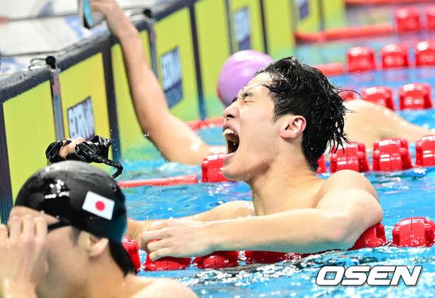 한국 대표팀 마지막 주자 황선우가 경기를 마친 뒤 기뻐하고 있다. 이날 한국 대표팀은 양재훈~이호준~김우민~황선우 순으로 헤엄쳐 7분01초73의 기록으로 금메달을 목에 걸었다. 2023.09.25 / ksl0919@osen.co.kr