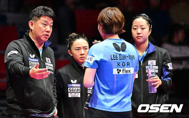 대한민국 오광헌 감독과 전지희, 신유빈이 이은혜 경기에 조언을 하고 있다. 2024.02.19 / foto0307@osen.co.kr
