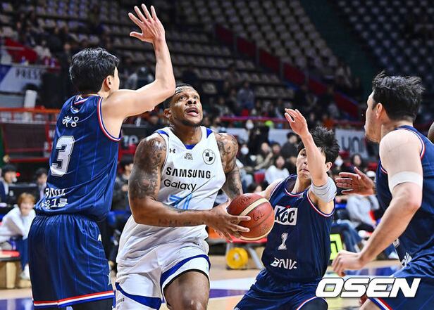 서울 삼성 이스마엘 레인이 부산 KCC 허웅, 이호현의 마크를 피해 골밑돌파를 시도하고 있다. 2024.03.20 / foto0307@osen.co.kr