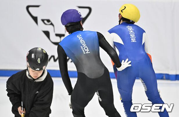 황대헌(보라, 강원특별자치도청)이 박장혁(노랑, 스포츠토토빙상단)에게 말을 걸고 있다. 2024.04.12 /cej@osen.co.kr