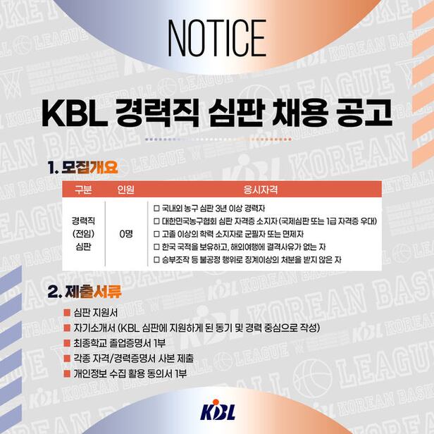 서류 전형과 면접 전형을 거친 뒤, 피지컬 테스트를 실시해 최종 합격자를 선발할 계획이다. 채용 관련 자세한 사항은 KBL 통합 홈페이지에서 확인할 수 있다.