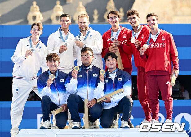 한국 양궁 김제덕, 김우진, 이우석이 은메달 프랑스, 동메달 튀르키예 선수들과 기념촬영을 하고 있다. 2024.07.30 / dreamer@osen.co.kr