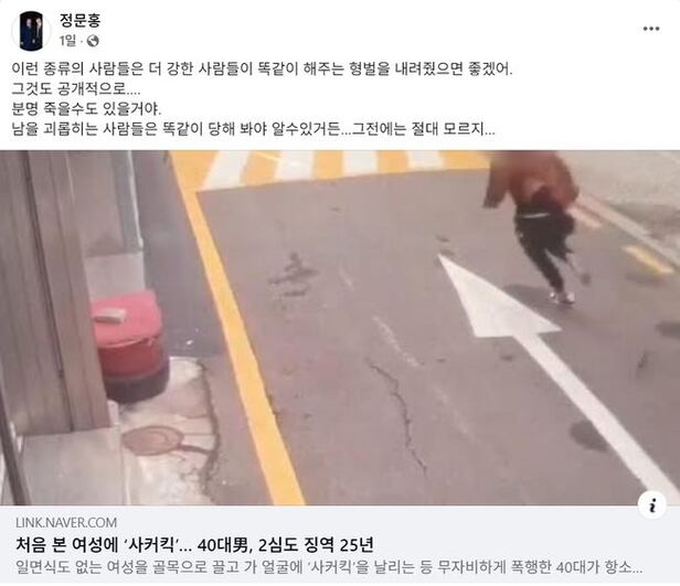정문홍 회장은 다음 날 자신의 SNS에 기사를 공유하고 "이런 종류의 사람들은 더 강한 사람들이 똑같이 해주는 형벌을 내려줬으면 좋겠어. 그것도 공개적으로. 분명 죽을 수도 있을 거야. 남을 괴롭히는 사람들은 똑같이 당해 봐야 알 수 있거든. 그전에는 절대 모르지"라고 썼다.