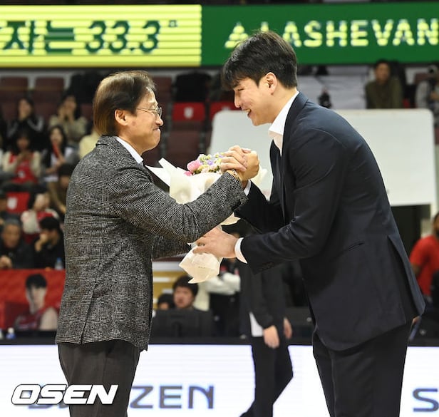 경기 앞두고 이종림 정관장 단장이 트레이드 된 김종규의 손을 맞잡고 미소 짓고 있다. 2025.02.01 / soul1014@osen.co.krㅇ