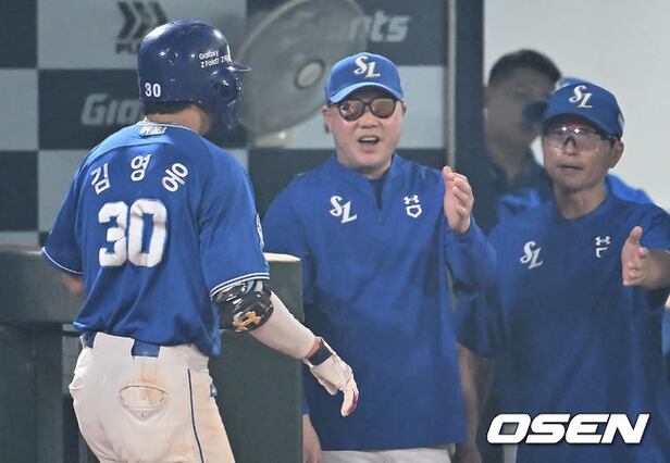 삼성 라이온즈 김영웅이 8회초 1사 좌월 솔로 홈런을 치고 박진만 감독과 하이파이브를 하고 있다. 2025.08.15