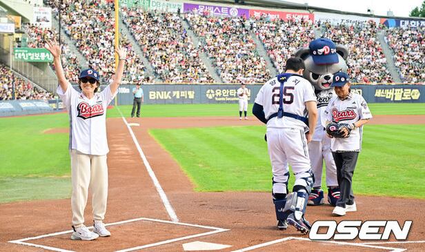 경기 앞서 광복절 맞아 독립운동가 노백린 장군 후손 노영탁 씨와 독립운동가 박회성 지사 후손 임인자 씨가 시구, 시타를 하고 있다. 2025.08.15