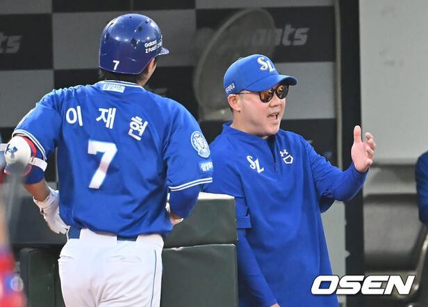 삼성 라이온즈 박진만 감독이 4회초 우월 솔로 홈런을 친 이재현을 맞이하고 있다. 2025.08.15