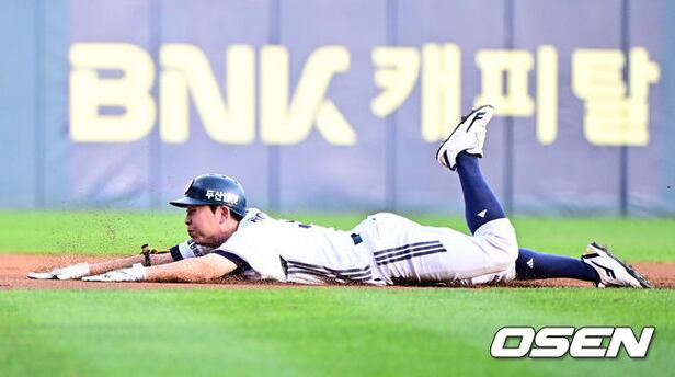 1회말 무사에서 두산 정수빈이 우중간 3루타를 날리며 슬리아딩 세이프되고 있다. 2025.08.16.