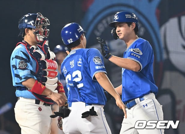 삼성 라이온즈 구자욱이 9회초 2사 우월 솔로 홈런을 치고 기뻐하고 있다. 2025.08.16