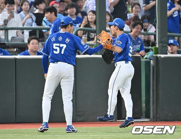 삼성 라이온즈 김성윤이 4회말 1사 1루 롯데 자이언츠 레이예스의 중견수 플라이 아웃때 1루 귀루가 늦었던 손호영을 잡고 이승현과 기쁨을 나누고 있다. 2025.08.17