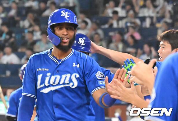 삼성 라이온즈 디아즈와 김영웅이 6회초 2사 만루 류지혁의 중견수 앞 2타점 안타때 득점을 올리고 하이파이브를 하고 있다. 2025.08.19