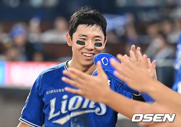 삼성 라이온즈 김성윤이 6회초 무사 2,3루 디아즈의 중견수 희생 플라이 때 득점을 올리고 하이파이브를 하고 있다. 2025.08.20
