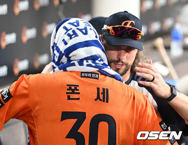7회초 수비를 마친 한화 폰세가 더그아웃에서 와이스와 포옹을 하고 있다. 2025.08.22