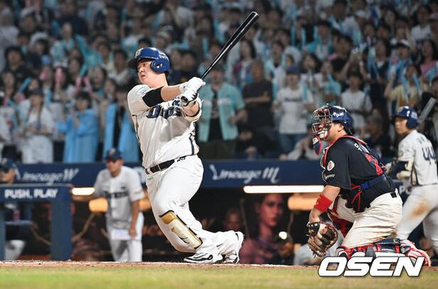 NC 다이노스 김형준이 6회말 1사 만루 동점 2타점 좌익수 앞 안타를 치고 있다. 2025.08.22