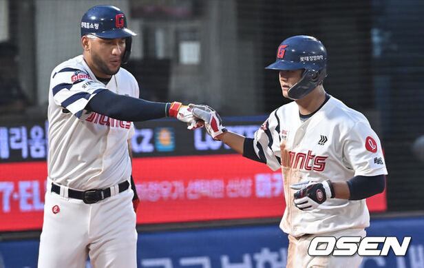 롯데 자이언츠 손호영이 1회말 1사 2루 고승민의 우익수 앞 1타점 안타때 득점을 올리고 하이파이브를 하고 있다. 2025.08.26