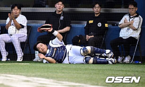 2회초 2사 두산 김기연이 포수 강민호의 파울플라이 타구를 포구하고 있다. 2025.08.27