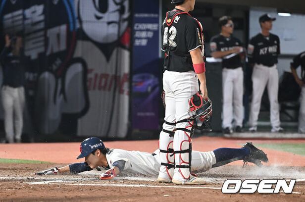 롯데 자이언츠 황성빈이 6회말 1사 1,2루 정훈의 1루 땅볼 아웃때 포수 송구 실책을 틈타 홈까지 쇄도, 득점에 성공하고 있다. 2025.08.28