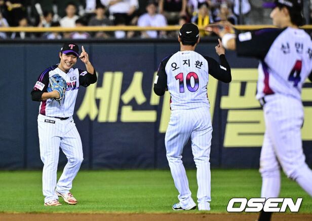 8회초 1사 LG 유격수 오지환이 키움 김건희의 뜬공을 아웃처리한 뒤 좌익수 박관우와 세리머니를 하고 있다. 2025.08.29