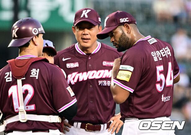 3회말 1사 1루 키움 이승호 코치가 마운드에 올라 알칸타라와 대화를 나누고 있다. 2025.08.31