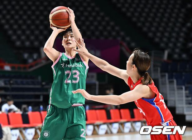 부천 하나은행 박진영이 덴소 아이리스(일본) 야부 미나미의 마크를 피해 골밑슛을 시도하고 있다. 2025.09.02