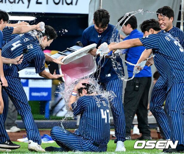 경기를 마치고 개인 통산 350홈런을 뽑아낸 삼성 강민호가 동료들의 물세례를 받고 있다. 2025.09.06